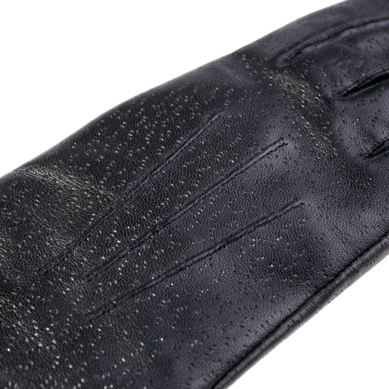Zum leichteren An- und Ausziehen, aber und auch als optische Aufwertung hat der Handschuh einen seitlichen Schlitz. Der Schlitz sowie der ganze Handschuhabschluss ist mit einem Umbugsaum paspeliert. Der etwas länger geschnitten Handschuh hat auf dem Handrücken eine klassische 3-Riefchen Aufnaht. Der sportlich vornehme Handschuh in schwarz passt zu nahezu für allen Gelegenheiten und harmoniert nahezu mit allen Farbe
