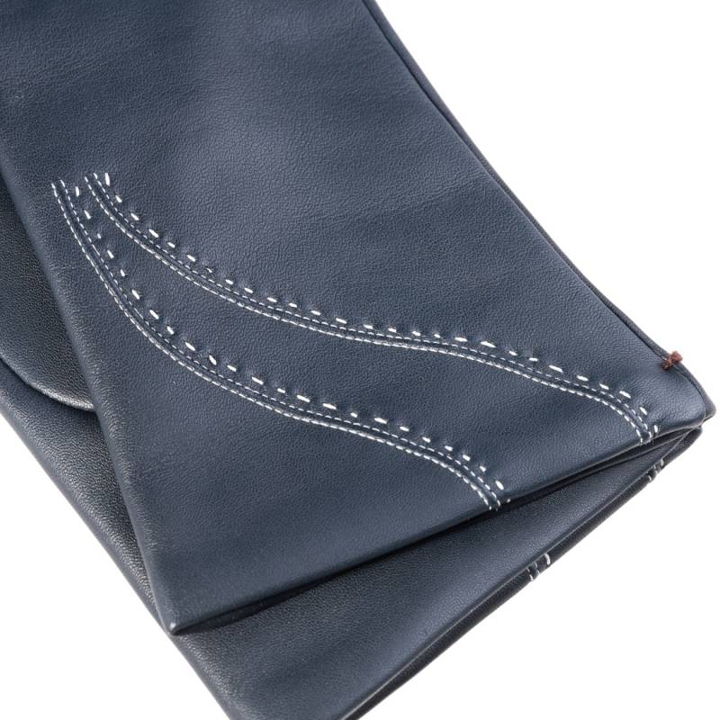 Bei diesem schwarzblauen, etwas länger geschnittenen eleganten SEEGER Lederhandschuh für Damen fällt die erhaben wirkende Doppelnaht über den Handgelenken ins Auge. Dazu wurde neben einer engmaschigen doppelten Steppnaht in Handarbeit ein Fadendurchzug mit hell abgesetzen Faden auf das dunkle Leder genäht.